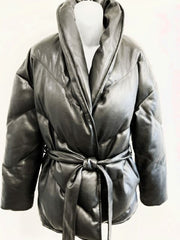 NWT faux leather tie waist puffer